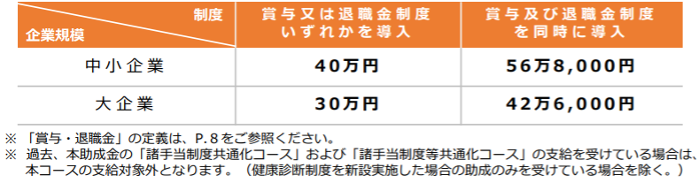 就業規則または労働協約の定めるところにより、すべての有期雇用労働者等に関して、 賞与・退職金制度を新たに設け、支給または積立てを実施した場合に助成するコースです。